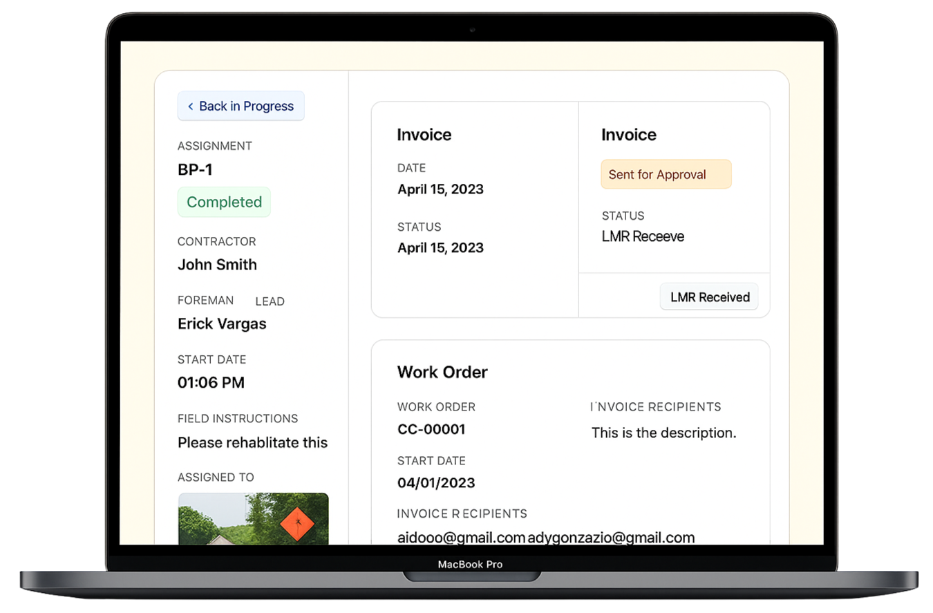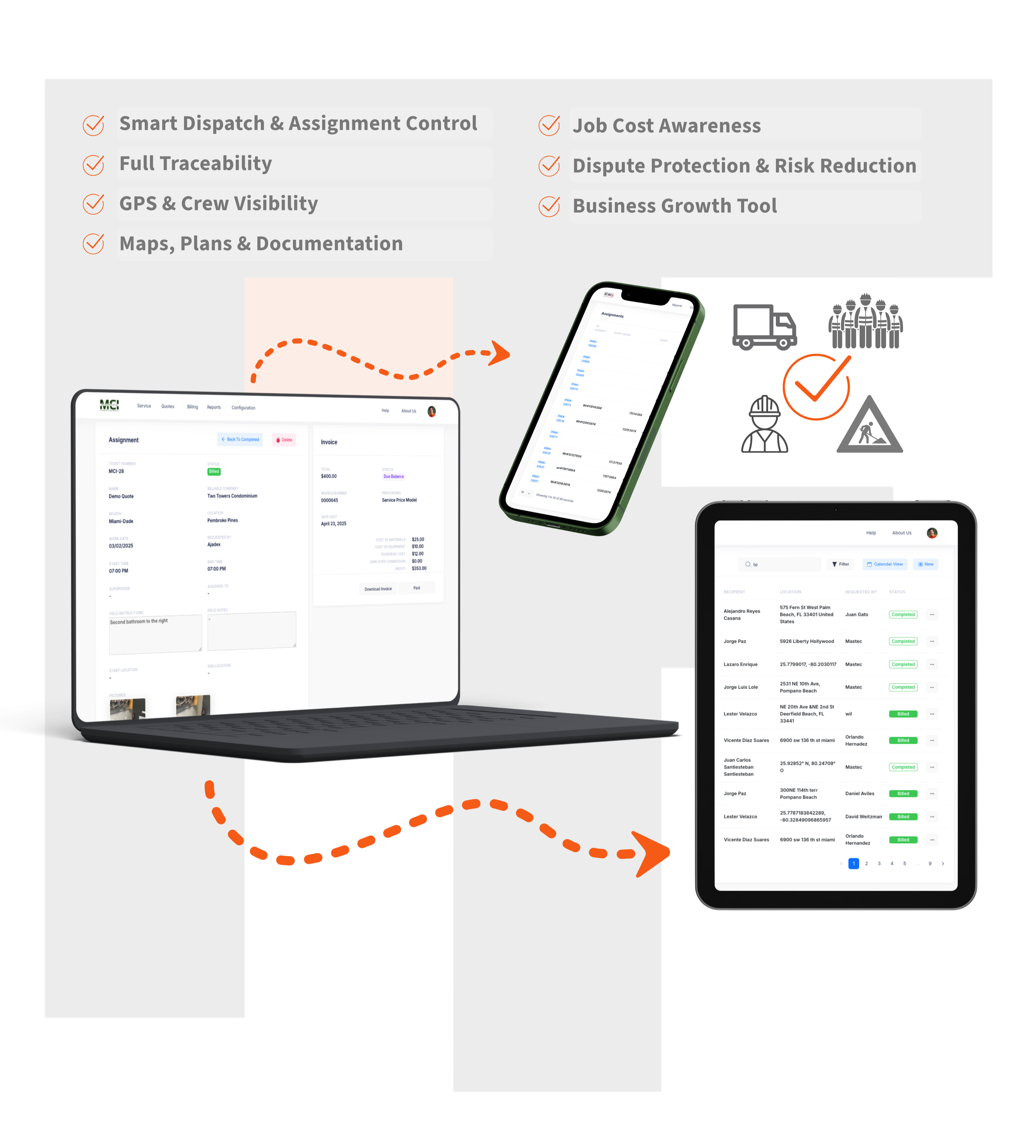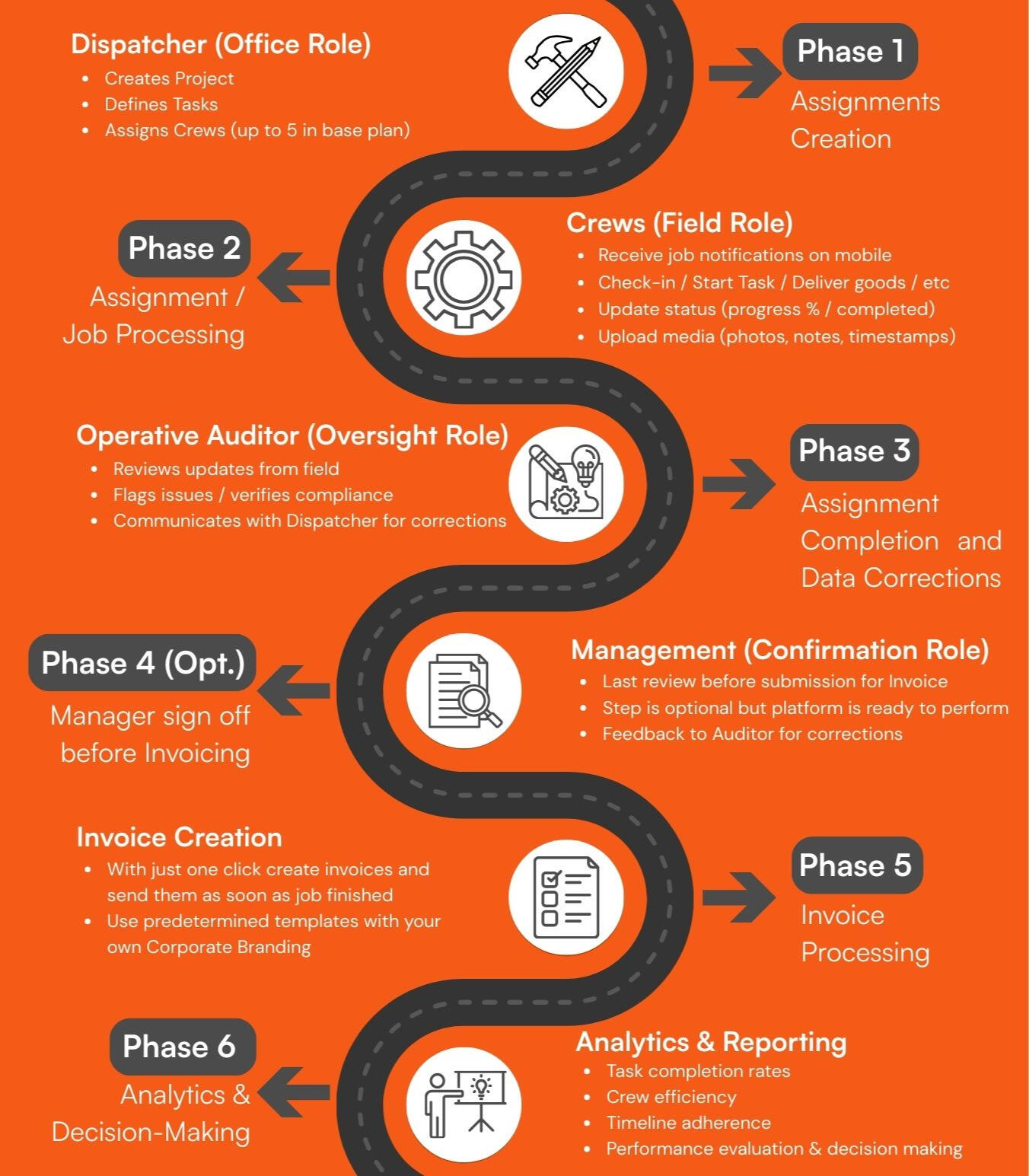 Each project flows through clearly defined roles—dispatchers, crews, auditors, managers, and billing—ensuring no step is skipped and no detail missed.